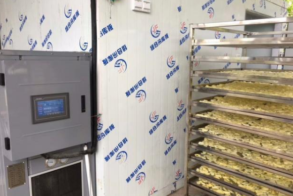 5、護(hù)色:將切好的蘋(píng)果片放在3%~5%的食鹽水中過(guò)一下進(jìn)行果片護(hù)色,以免氧化變褐。護(hù)色后擺入烘干機(jī)托盤(pán)放入小推車(chē),準(zhǔn)備進(jìn)行烘干;