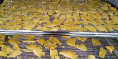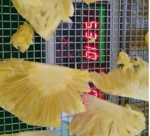 切好的菠蘿片進(jìn)入熱泵烘干系統(tǒng)里烘干的過程,可以分成5段完成,一段,烘干,不除濕,時(shí)間1.5個(gè)小時(shí),內(nèi)外溫度一致,溫度50度,二階段,溫度53度,開始連續(xù)除濕,除濕到40%,第三階段溫度58度,連續(xù)除濕,濕度26%,第四階段溫度55度,濕度20%,連續(xù)除濕,第五段溫度48度,濕度18%,連續(xù)除濕1小時(shí),烘干完成。