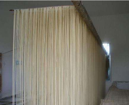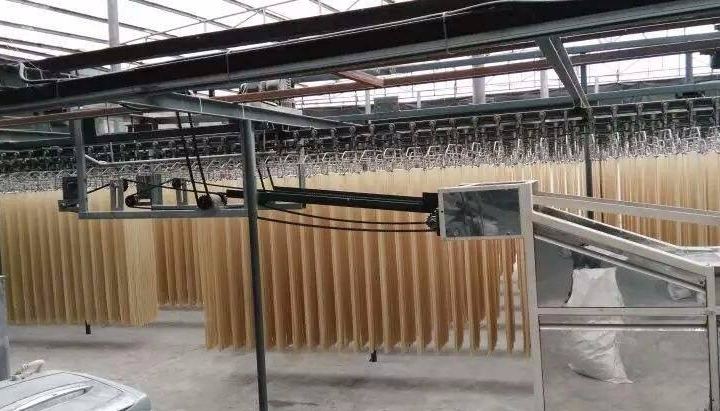 自然干燥就是在風和日暖(氣溫不低于20℃)相對濕度 60%一 80%的地區或季節,將濕面條掛在掛桿上,自然風干。由于烘干時間長,因此產品質量好且不易出現酥面。我國民間多用此法。烘房干燥可分為固定式與移行式兩種,前者掛桿固定,將面條掛在掛桿上后送入烘房,經熱空氣吹干,屬間歇式生產。移行式烘干是一種連續烘干方式,在一隧道式烘房中進行,干燥裝置由鼓風機、散熱器、熱風管道、擴散風扇用濕機等組成,移行裝置由機架、鏈條、鏈輪、傳動軸、電動機等組成,面條掛在冊上進入烘房,在烘房中緩緩移行,達到干燥要求。
